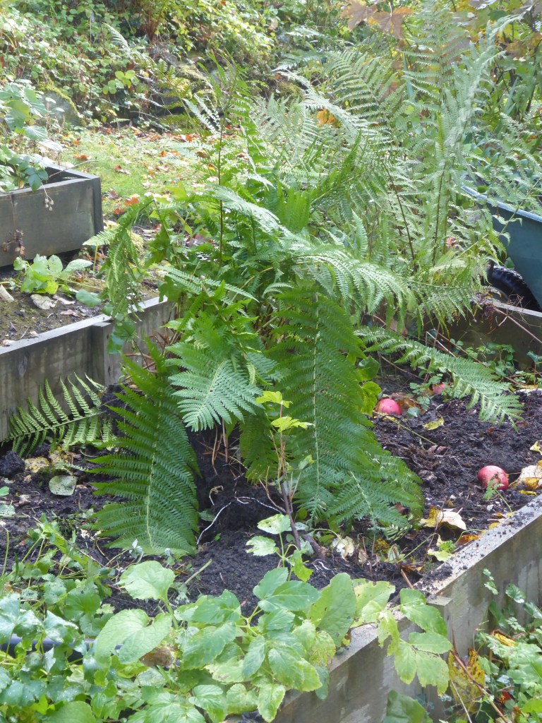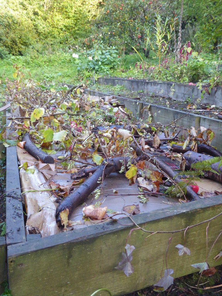 In the image below, ground elder was left, and cardboard laid over all this perennial weed. The fern was dug out, and planted elsewhere. Hazel branches were used to stop the cardboard blowing away, and the foliage will now naturally decompose, adding nutrients to the soil over winter as they rot down. If we can get a good layer of well rotted manure onto this over winter, that would be even better.