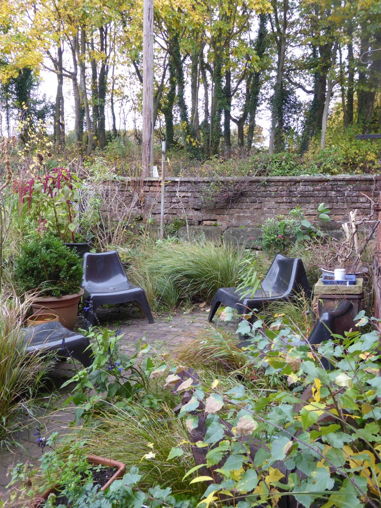 The wooden summer garden furniture has been stored away, and replaced with these low slung weather resistant chairs . I am hoping for some sharp dry days, where I might choose to have a coffee and watch the visiting wildlife on the sturdy seed heads.