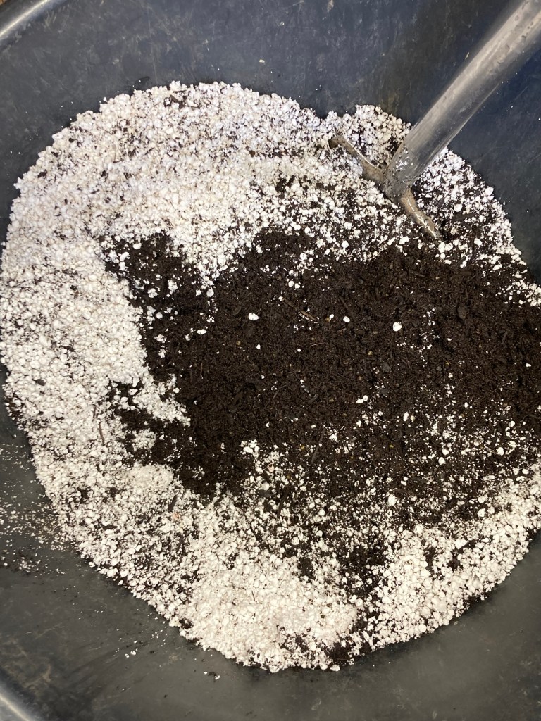 Use a mix of 50/50 peat free compost and perlite. Perlite is used as it is sterile, provides good drainage and helps to prevent compaction of the growing medium. It is important to lightly dampen down the perlite first as it can be quite dusty. For sowing, see images below. Once sown, put outside on a table and wait for the winter weather to start the germination process.