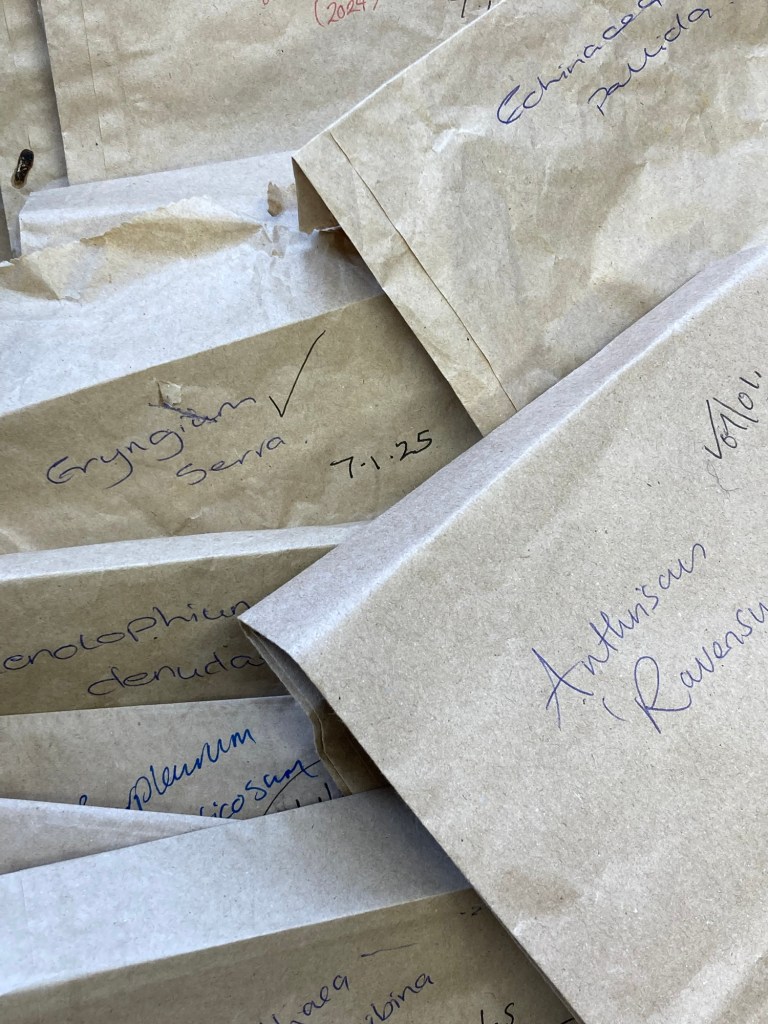 2. If gathering your own seed , the starting point of this process starts in mid /late summer. At Wildegoose we watch seed pods and seed heads ripening in the borders. A useful guide as when to harvest is when seed pods start to loose their vegetative colour, turning brown and start to shrivel in the process. If time allows you could open some surplus seed pods to check if the seeds are ripening, or if they are still fresh. You will notice fresh seed can also feel less dry. Seed heads are collected with the stem still attached and put into brown paper bags.