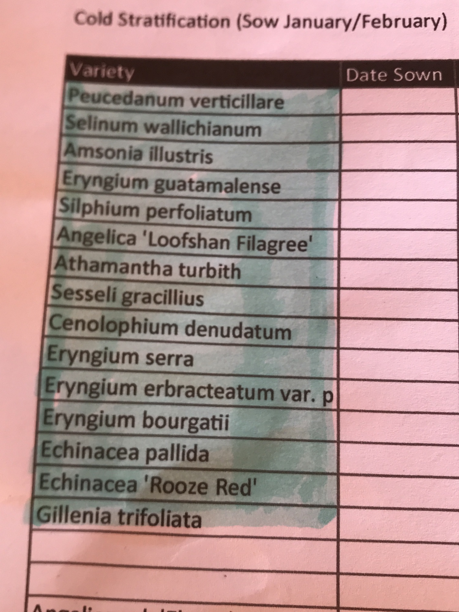 Umbellifers, Eringiums and members of the Ranunculacea family are prevalent on the sowing list. It is always very important to check the family , as when sowing Thalictrum which is a member of the Ranunculacea family the seed coat is slightly toxic to the touch ( infact the whole plant is ) So remember to wash your hands carefully afterwards. Reputable seed companies always provide this type of information on the growing instructions, but if gathering from your garden you might not be aware of a plants toxicity. So a little homework on seeds is really important before you start.