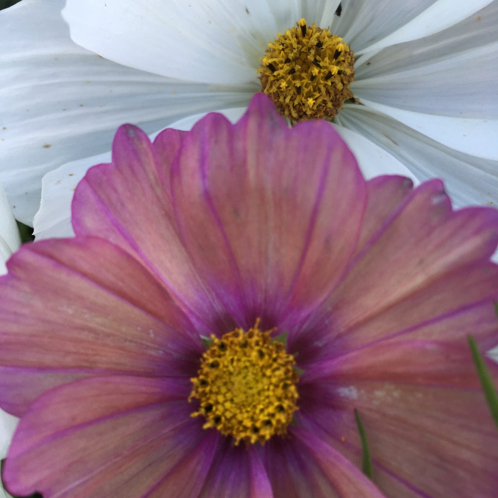 Cosmos, a truly beautiful and very simple seed to sow, there is a huge selection of cultivars out there to choose from. Cosmos Xsensa, is an incredible colour combination of iridescent peach and raspberry. Cosmos Cupcake behind.
