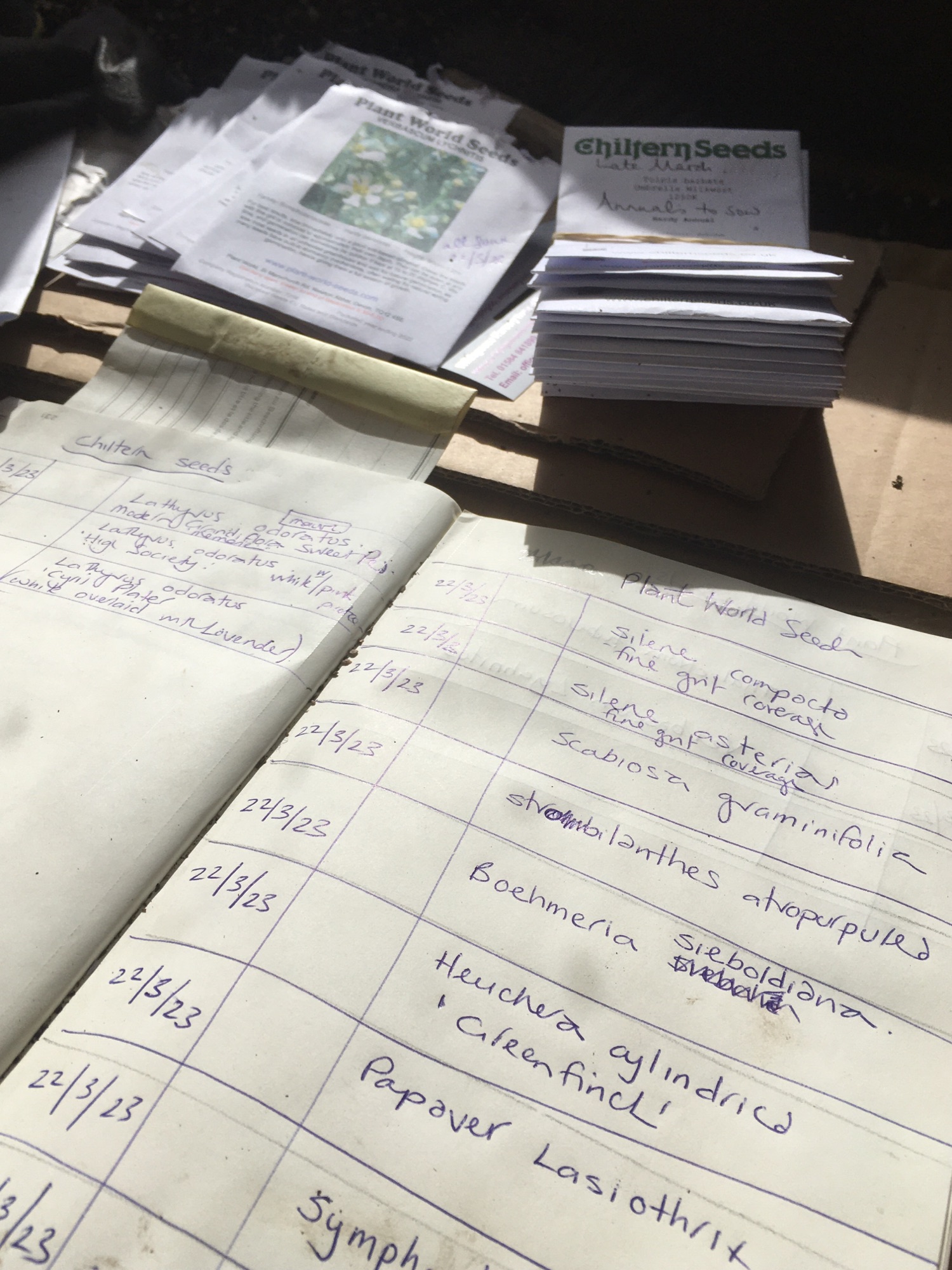 A festival of Christmas lights, favourite flower vases and ornamental grasses at homeWe always loose the propagation pencils at Wildegoose nursery – so I made a pyrography stenciled box for them Snow at home in November 2023Haw frost in our orchardMartin and Judy’s new garden.I focussed my writing on this new build garden in 2023.Scottish thistles self seeding at home. I never forget to grow the magnificent annual Tithonia rotundifolia The TorchDahlia Merkensis from seed in March, and flowering by July No dig orchard renovation at homeSelf seeded feverfew at Martin and Judy’s and Allium sphaerocephalon. Chrysanthemums are my new thing .Late summer at home.I often cut big collections of flowers for the cafe at wildegoosenursery.First go at Wedding flowers – the theme was bohemia, and the location – Ludlow Castle.A pen and ink of our garden by my husband John. Infact it was a stick rather than a pen. I am planning on making this into a lino cut over my Christmas break.My work desk at Wildegoose nursery.Busy propagating at Wildegoose A visit to the magnificent Great Dixter Gardens in Rye in early autumn. Start of a foliage lino cutA spring door garland for one of my friends .We only use freshly cut material from the gardens when making swags and door wreaths at Wildegoose nursery .Frost on the fruit tree at home