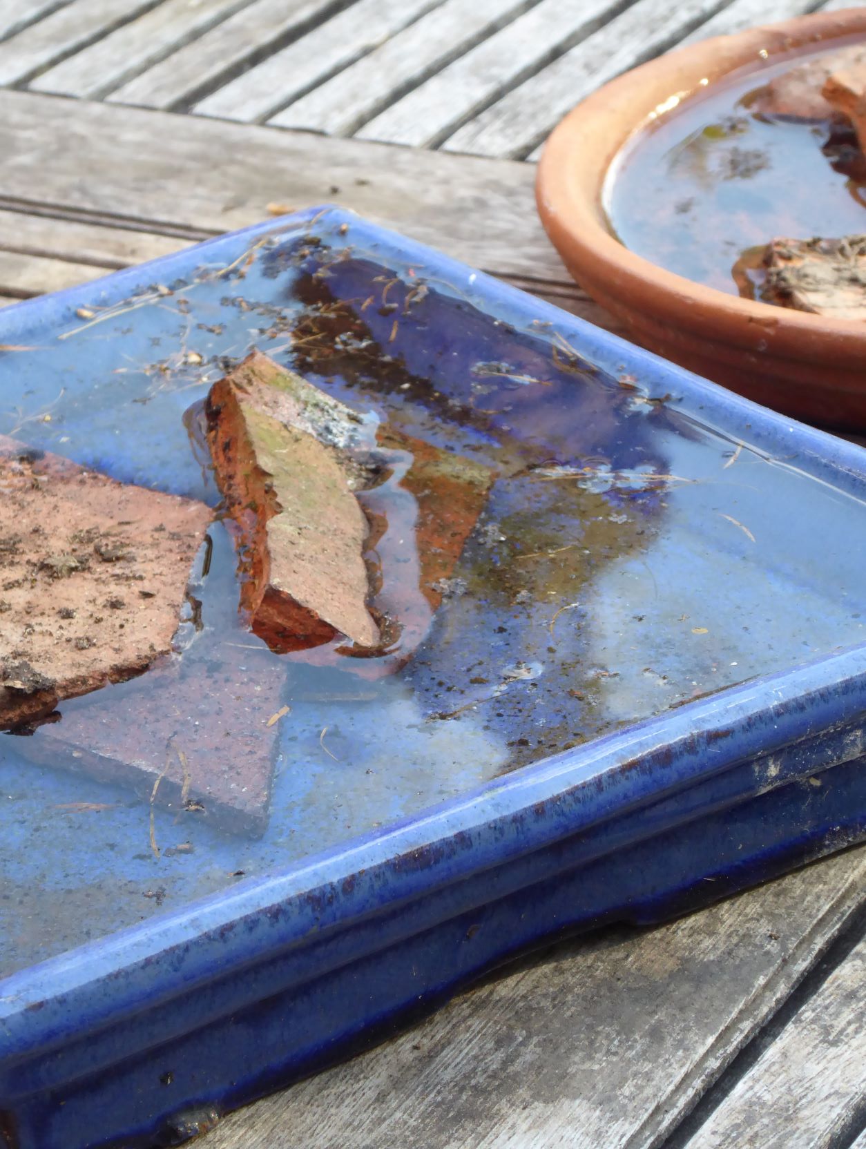 April has been quite a dry month. Honey bees were searching for water in the garden today, so I decided to make some watering stations. I would recommend we all do this to help the bees. Just make sure the container is shallow, and put in some gravel, old sticks , or in my case bits of old plant pots to enable them to drink in safety, rather than falling into the water.