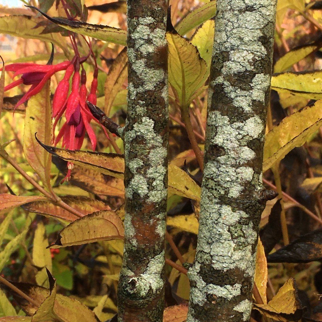 Why ? I really liked how the lichen covered stems of the Rowan divided up the image, which in turn gave visual clarity to the three blocks of the autumn foliage of Helianthus Lemon Queen. And finally ! I loved the extremely vibrant pop of colour from the Fuchsia flower.