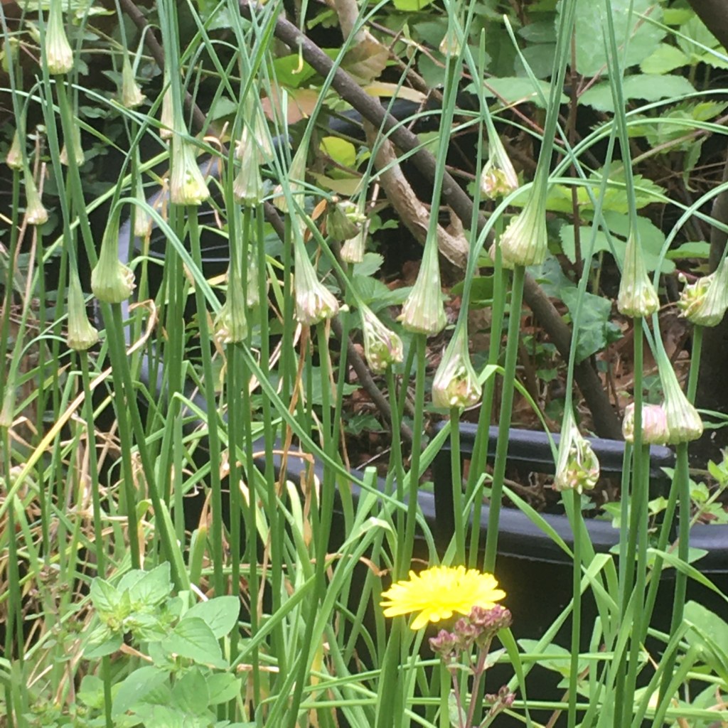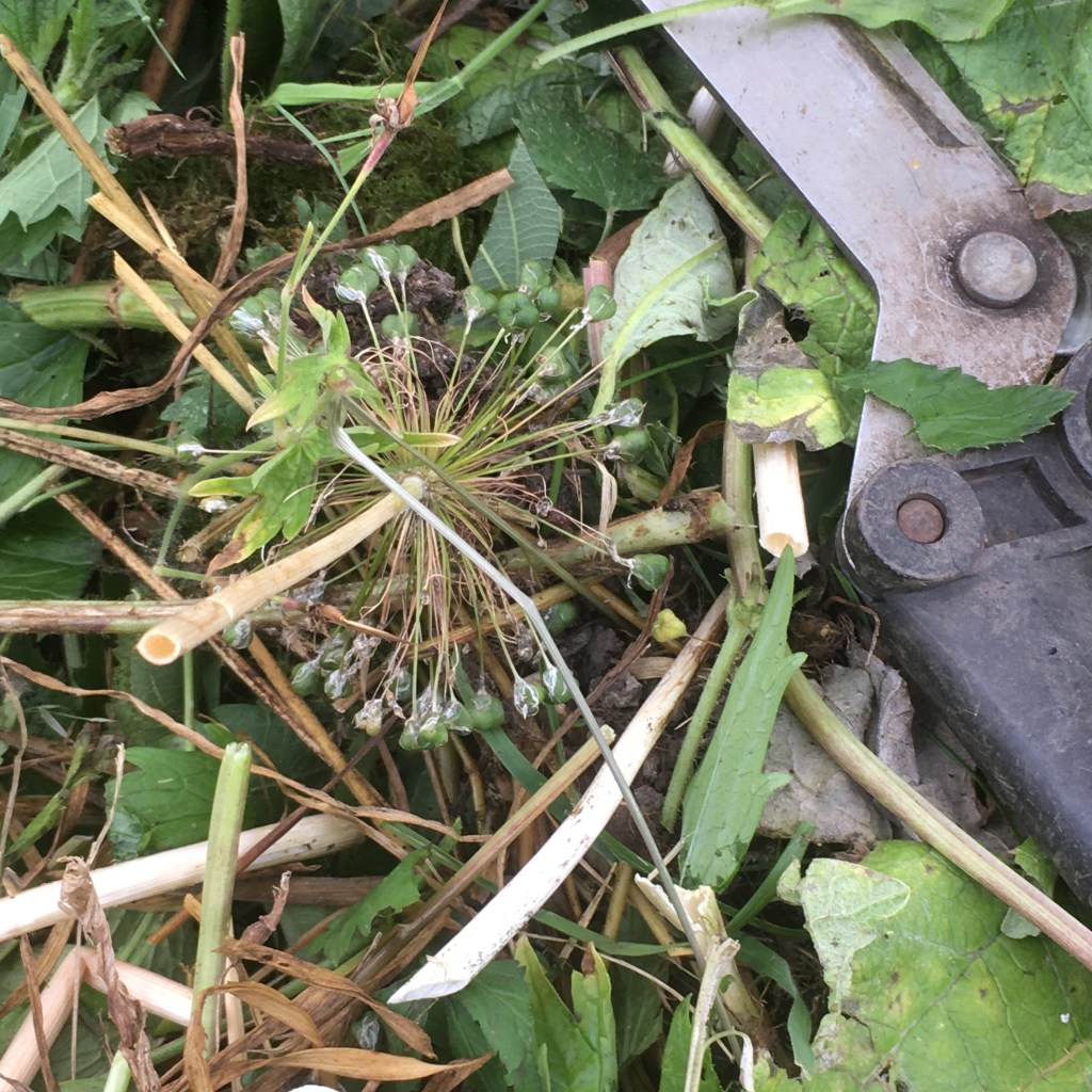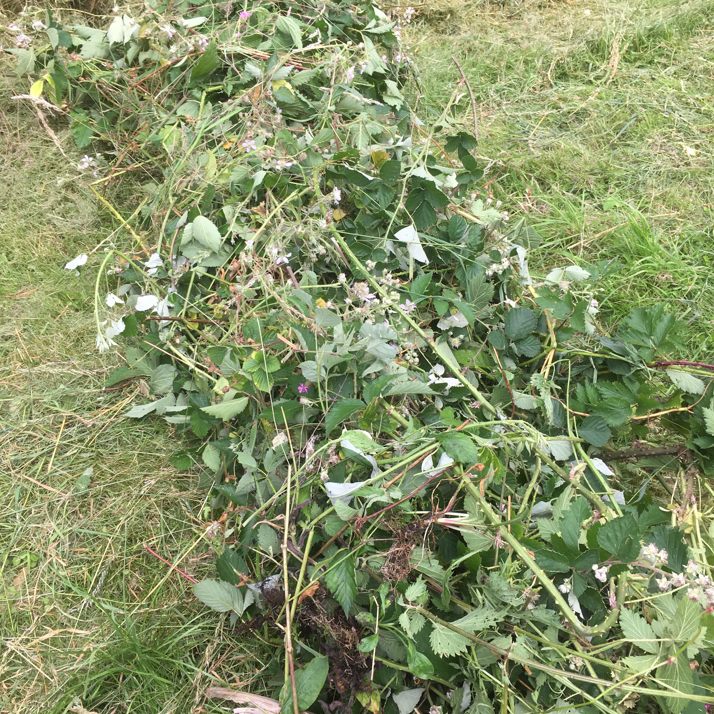 We have about twenty fruit trees in our orchard, and they all need mulching, as there are a lot of nettles growing through some of the trees. I am using the orchard green waste from (this years) bramble growth and nettles. As I rake the long cut stems together, I have ended up with equally long rolls of green mulch material. Cardboard has been put down, to stop the nettles coming back, and the mulch is placed on top. I have also added in some ripe flower seed heads of Alliums and white campion into the mulch rolls. This could be a really good nectar source for pollinating insects if the seeds germinate and get to flowering stage.