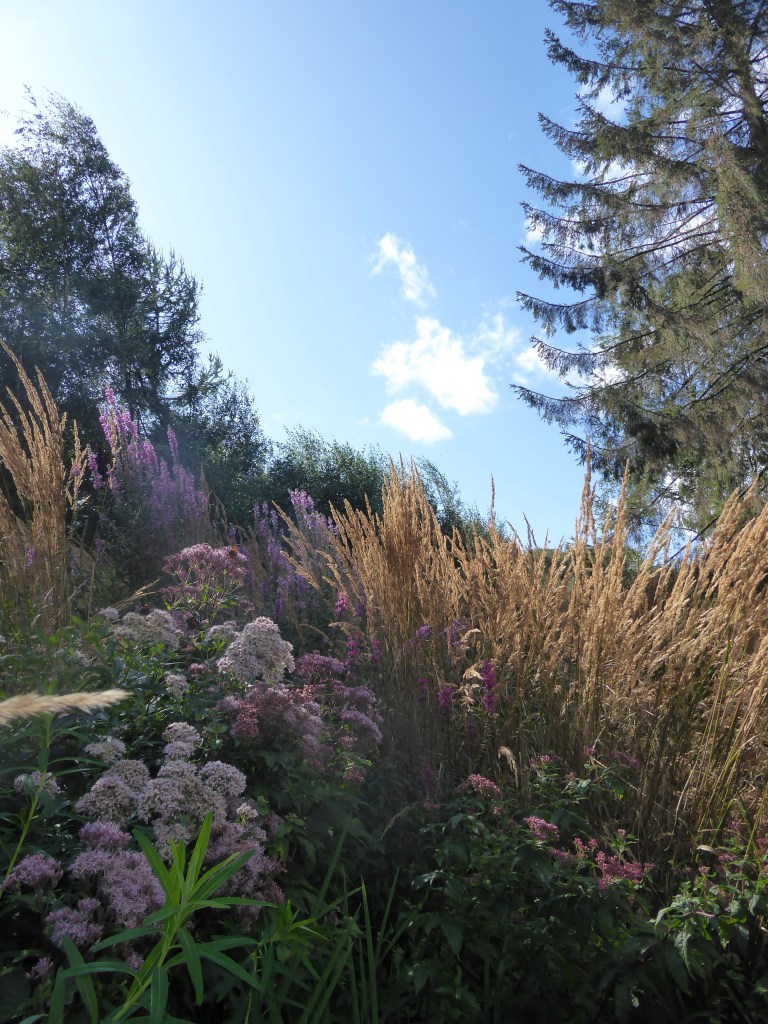 Late summer. My garden is full of Dahlias, Sunflowers and Rudbeckias. Courgettes in the greenhouse have made a run for the roof trusses, and the tomatoes are ripening.