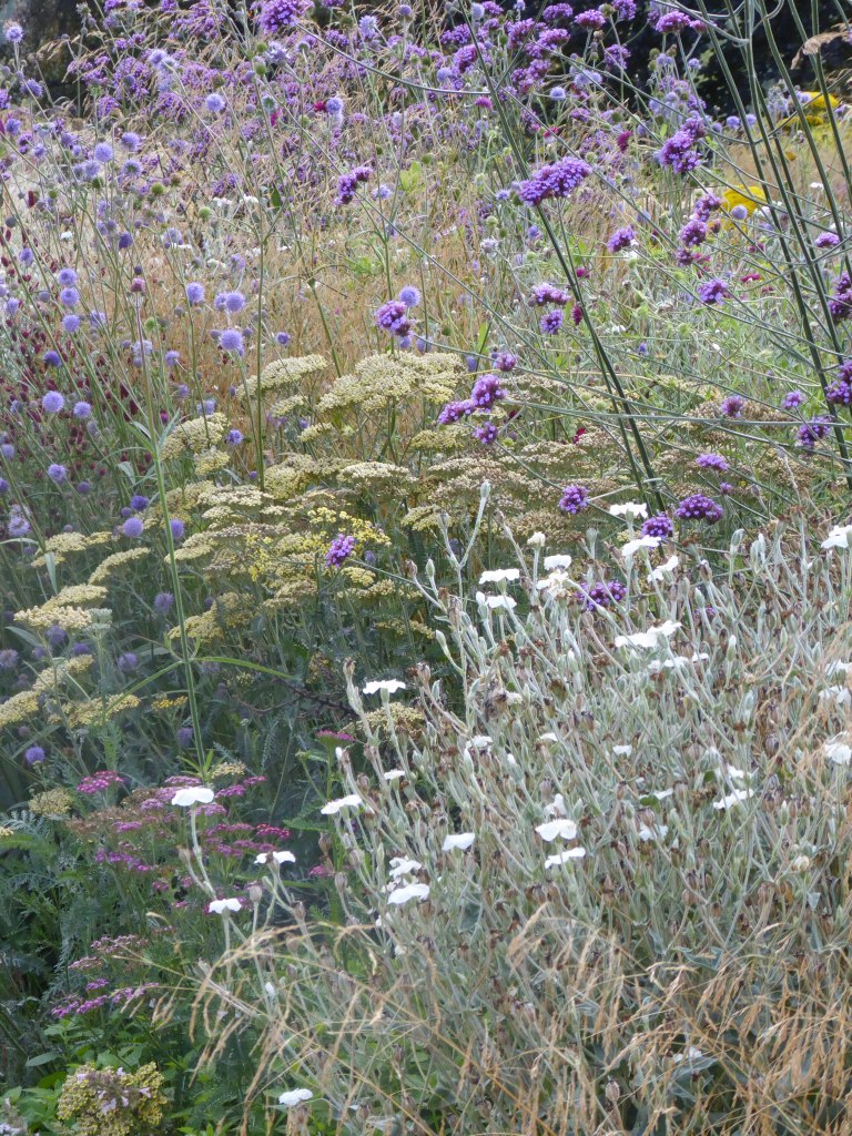 The success rate of this has been variable. I need to learn to match seedlings that can compete with each other. I found the Verbena bonariensis was crowded out when mixed with the Tithonia, and the same can be said for the Daucus carota. Next year I will need to remember to prick out and grown these on as clumps of single cultivars prior to being planted out. Sadly, I think the chrysanthemum met its match with slugs.