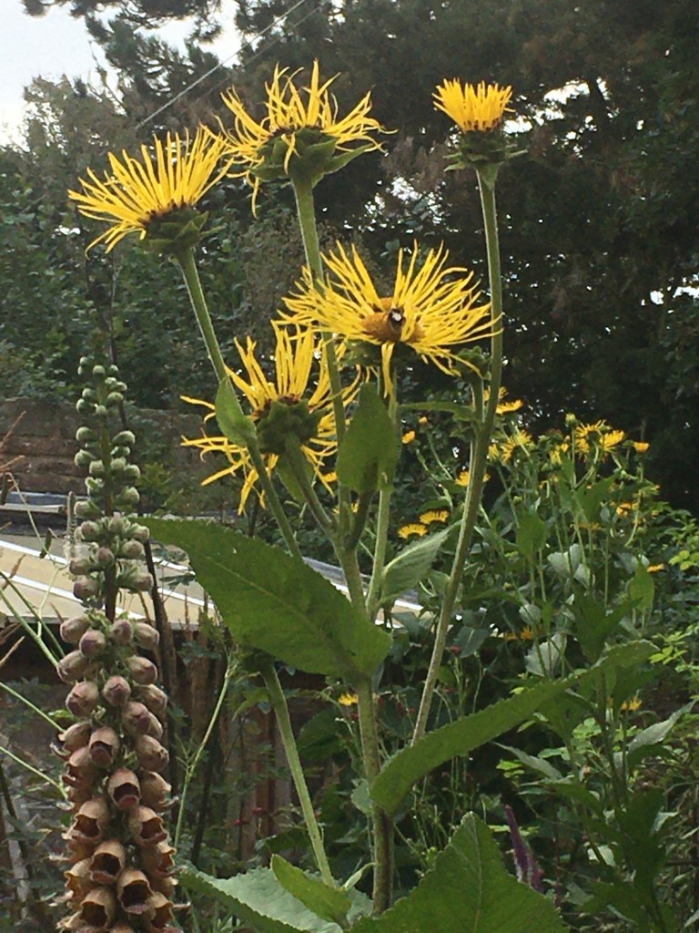 I saw Inula gigantea at Great Dixter three years ago. On returning home I bought a packet of Inula helenium elecampane seeds, and they are now towering and flowering away in my garden. Definitely worth the wait – what a fabulous perennial.